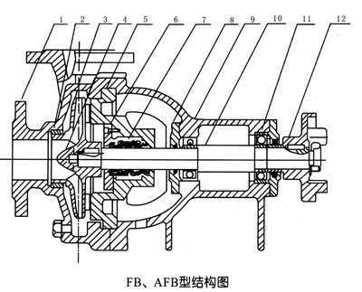 AFB型不銹鋼耐腐蝕離心泵是在FB型耐腐蝕泵的基礎(chǔ)上改進(jìn)設(shè)計(jì)的,均采用新型的付葉輪動力軸封裝置,采用先進(jìn)水力模型,新穎結(jié)構(gòu)與高強(qiáng)度組合式雙端面機(jī) 械密封,具有高次節(jié)能、結(jié)構(gòu)緊湊、性能穩(wěn)定、使用可靠等優(yōu)點(diǎn)。屬單級單吸懸臂式耐腐蝕離心泵。該泵與輸送介質(zhì)接觸的過流部份零件,均采用 1Cr18Ni9Ti材料制造。用于輸送不含固體顆粒,有腐蝕性液體,被輸送介質(zhì)溫度為-20℃~120℃,泵進(jìn)口壓力不大于2kg/cm2。采用雙端面 密封冷卻裝置可輸送300℃左右的高溫介質(zhì)。