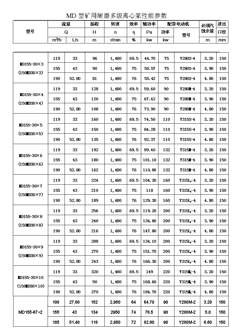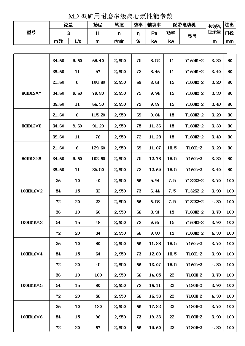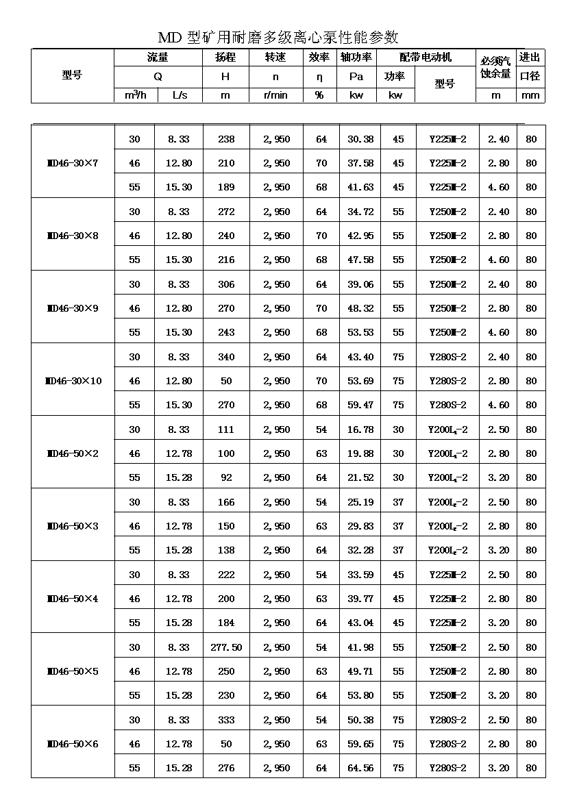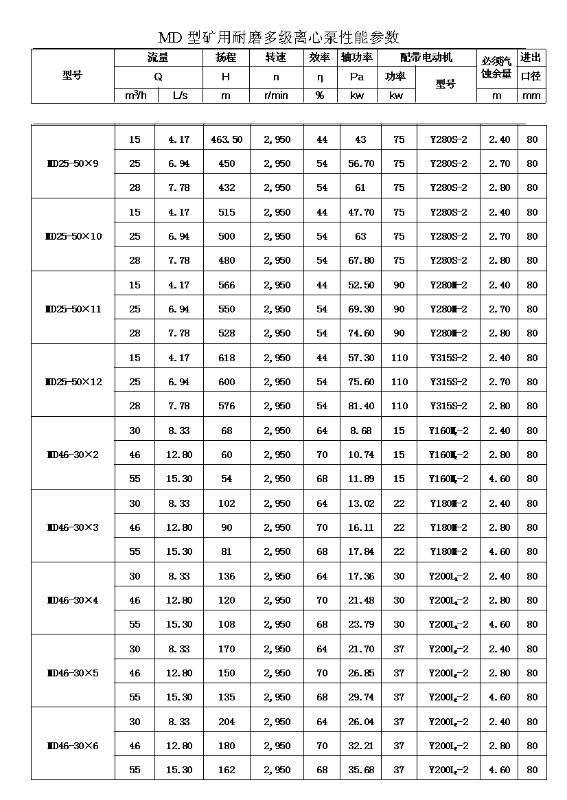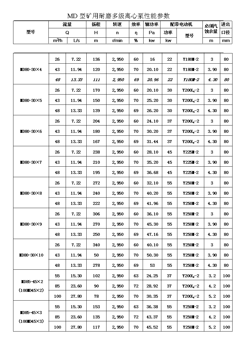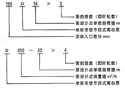 注:D(DF多級(jí)耐腐蝕離心泵、DY多級(jí)離心油泵、MD多級(jí)耐磨離心泵)80-30為習(xí)慣表示方法,其中80表示泵吸入口直徑為80mm,30表示泵設(shè)計(jì)點(diǎn)單級(jí)揚(yáng)程為30m,其它含義與上述表示方法相同。