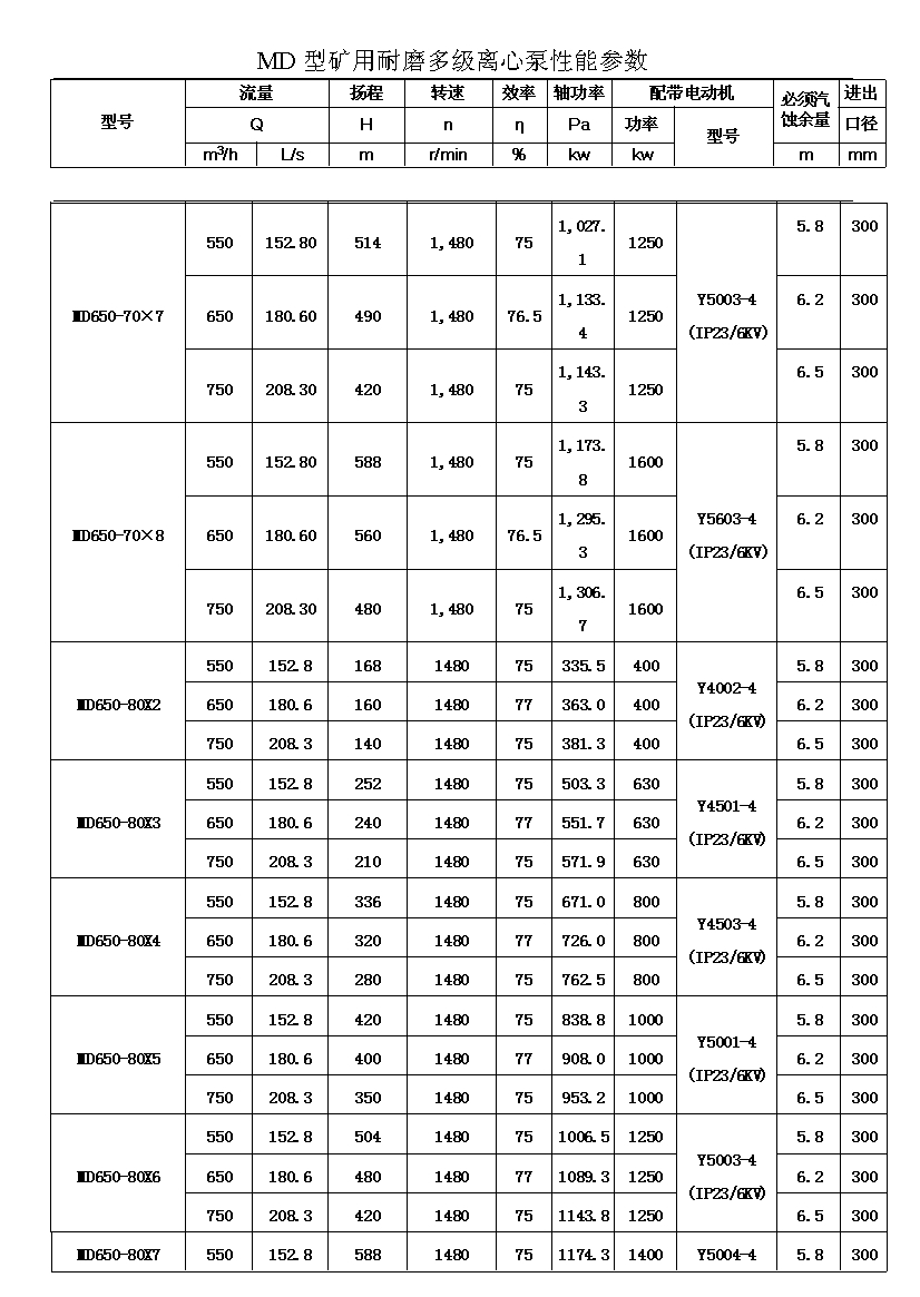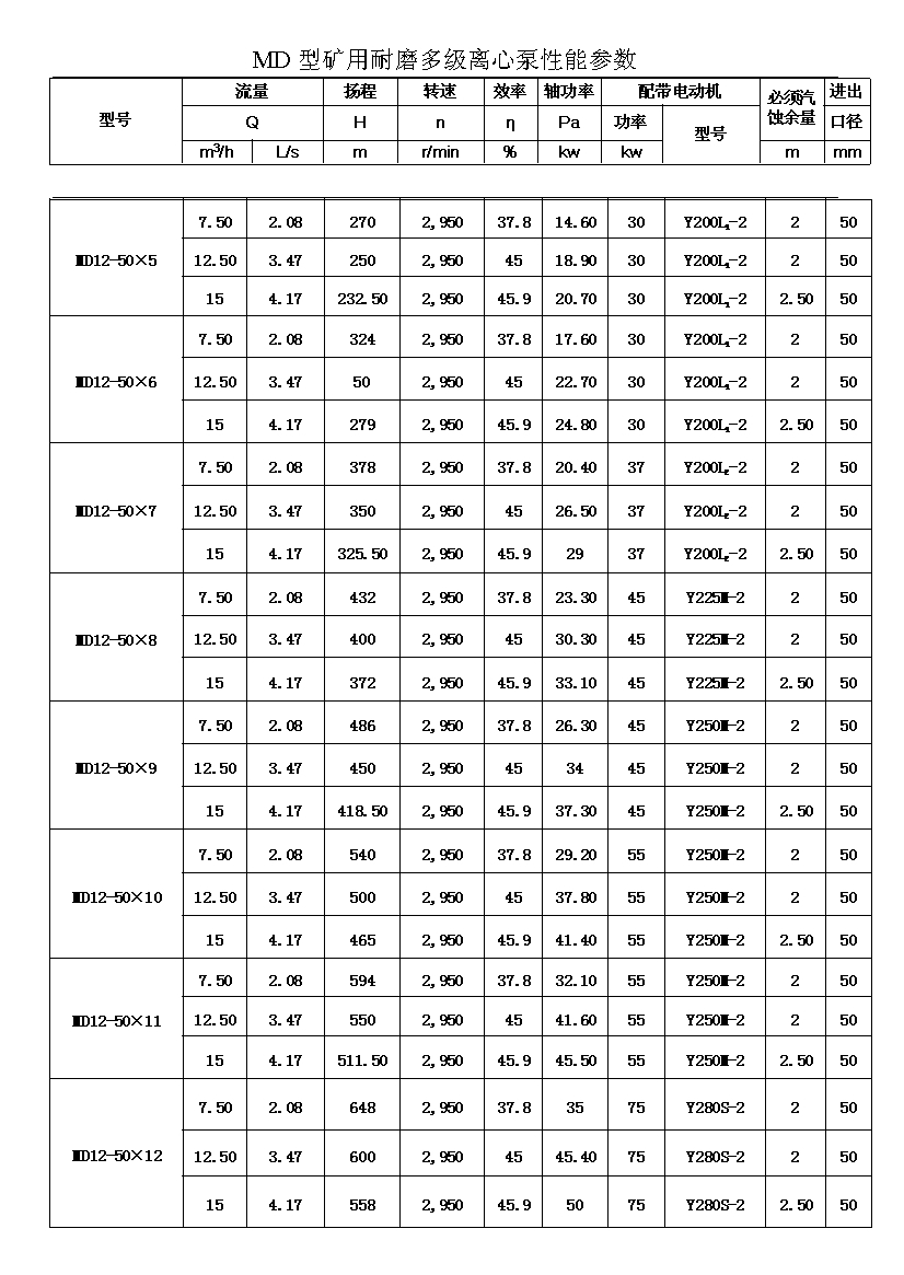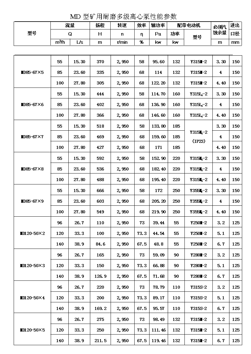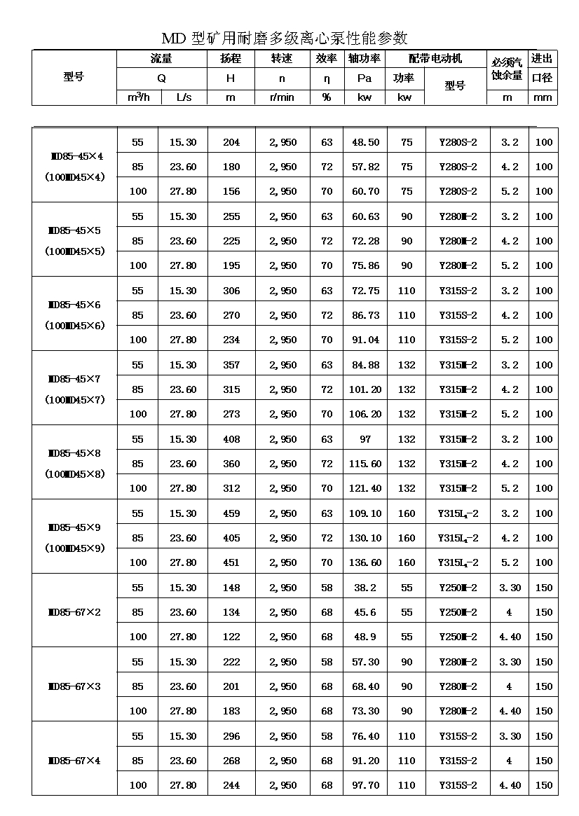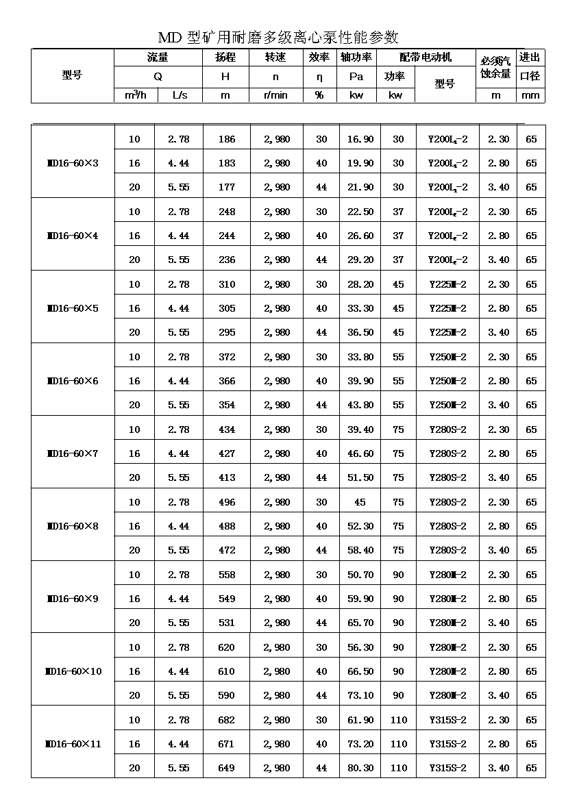 注:D(DF多級(jí)耐腐蝕離心泵、DY多級(jí)離心油泵、MD多級(jí)耐磨離心泵)80-30為習(xí)慣表示方法,其中80表示泵吸入口直徑為80mm,30表示泵設(shè)計(jì)點(diǎn)單級(jí)揚(yáng)程為30m,其它含義與上述表示方法相同。