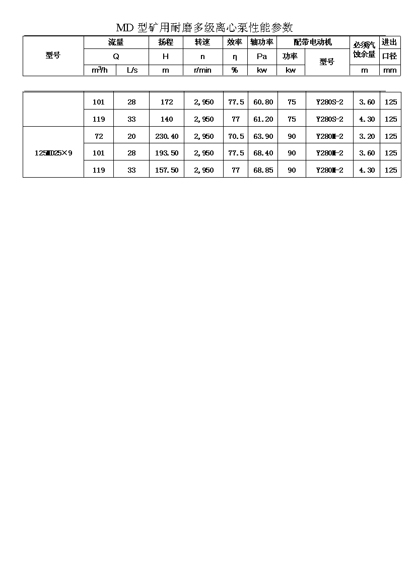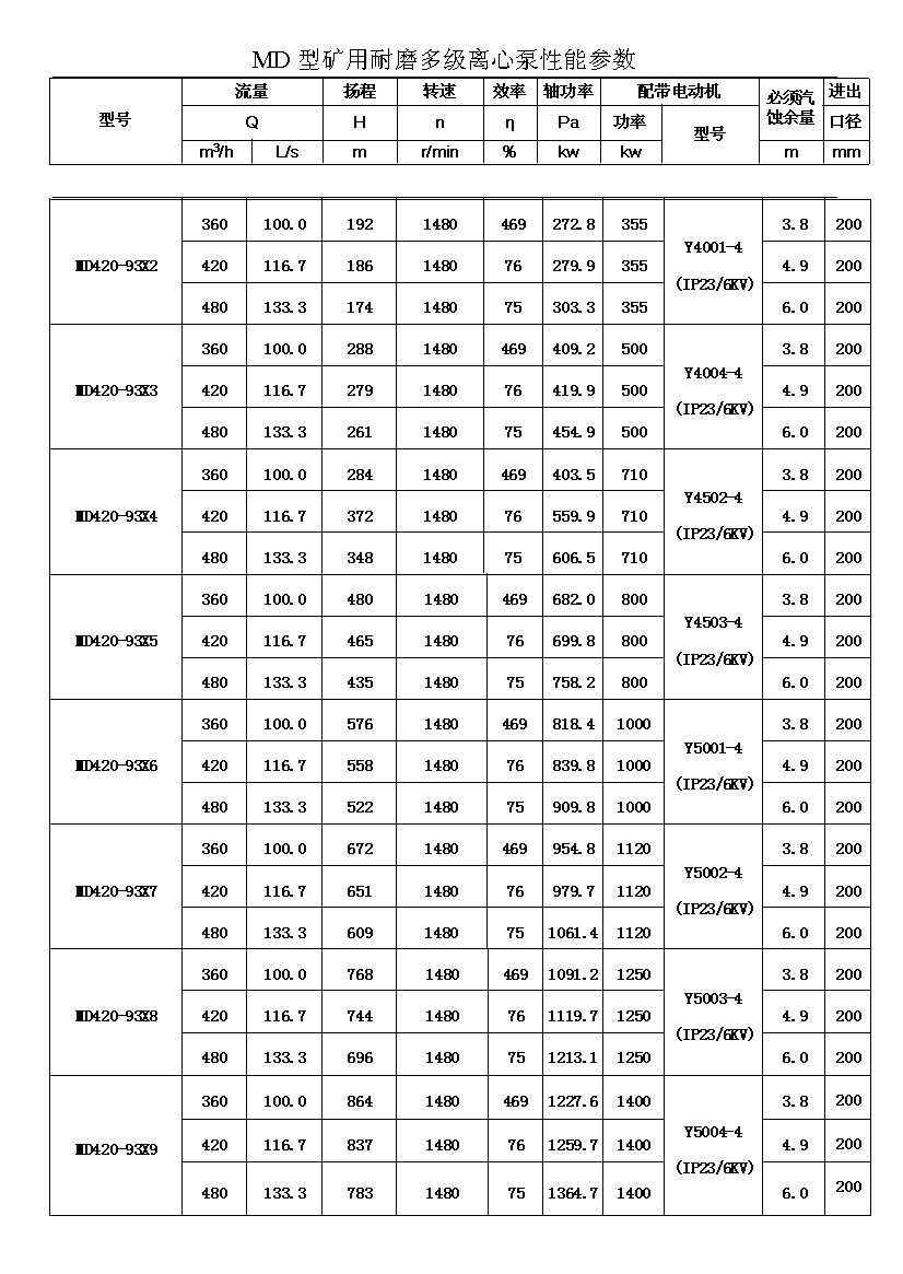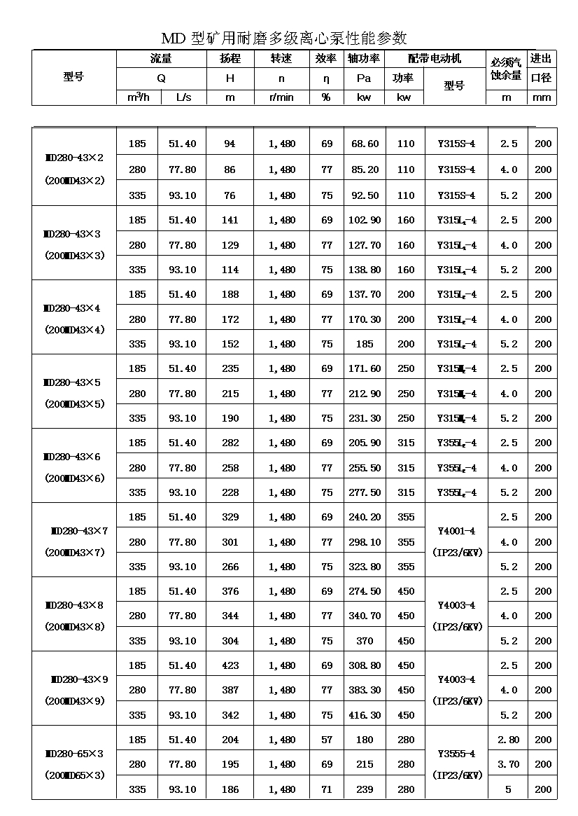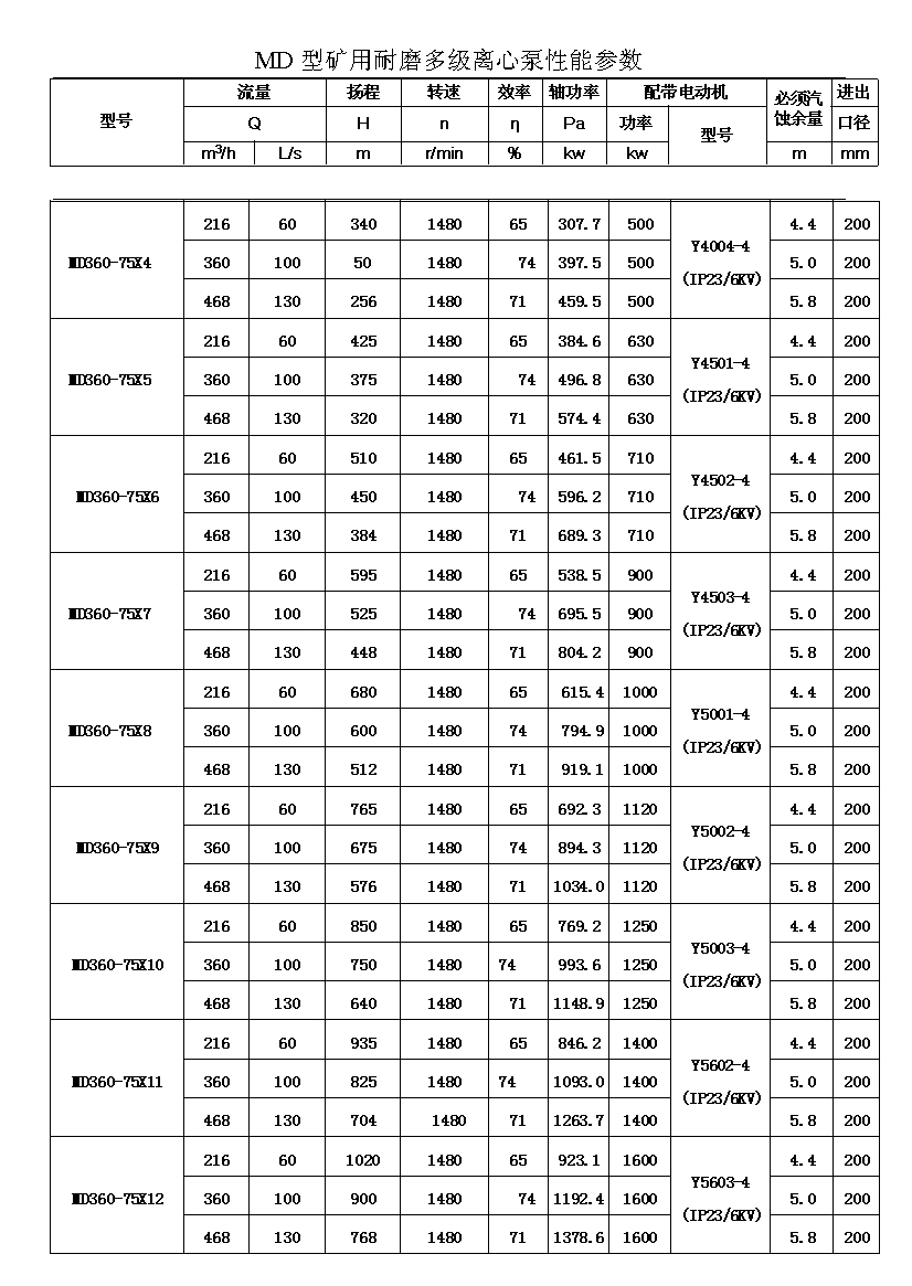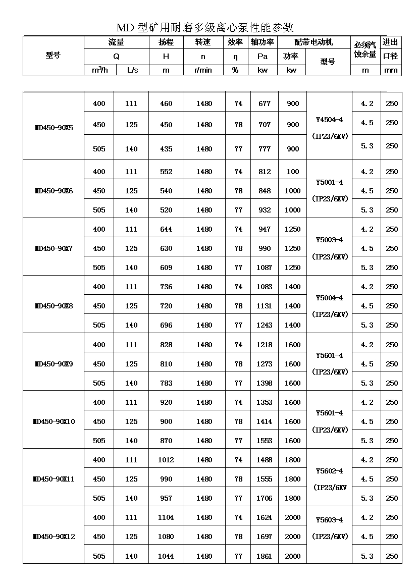 注:D(DF多級(jí)耐腐蝕離心泵、DY多級(jí)離心油泵、MD多級(jí)耐磨離心泵)80-30為習(xí)慣表示方法,其中80表示泵吸入口直徑為80mm,30表示泵設(shè)計(jì)點(diǎn)單級(jí)揚(yáng)程為30m,其它含義與上述表示方法相同。