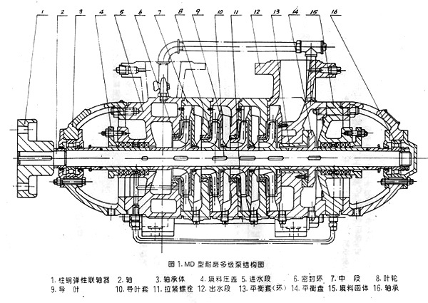 MD系列泵系臥式、單吸、分段式多級(jí)離心泵,吸入口為水平方向,吐出口與水平垂直向上。泵的進(jìn)水段、中段、出水段、軸承體待泵殼體部分通過拉緊螺栓聯(lián)成一體,并根據(jù)泵的揚(yáng)程選擇泵的級(jí)數(shù)。